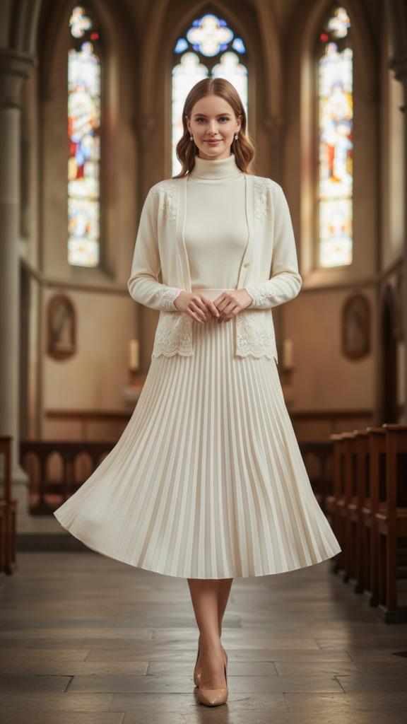 Coordinated sweater sets paired with pleated skirts form elegant and modest apparel choices for Baptist worship services. Matching cardigans and shell tops provide chic layering options that respect conventional dress codes.