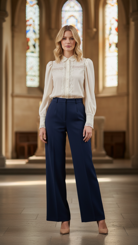 For a tasteful, modern twist, try pairing a blouse adorned with lace trims and puff sleeves alongside tailored high-waisted pants. This sophisticated look merges feminine softness with clean lines suitable for church gatherings.