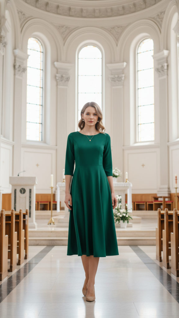A midi dress with three-quarter sleeves offers a stylish, modest option tailored to Baptist service environments. The length gently falls beneath the knee, providing an elegant yet understated silhouette.