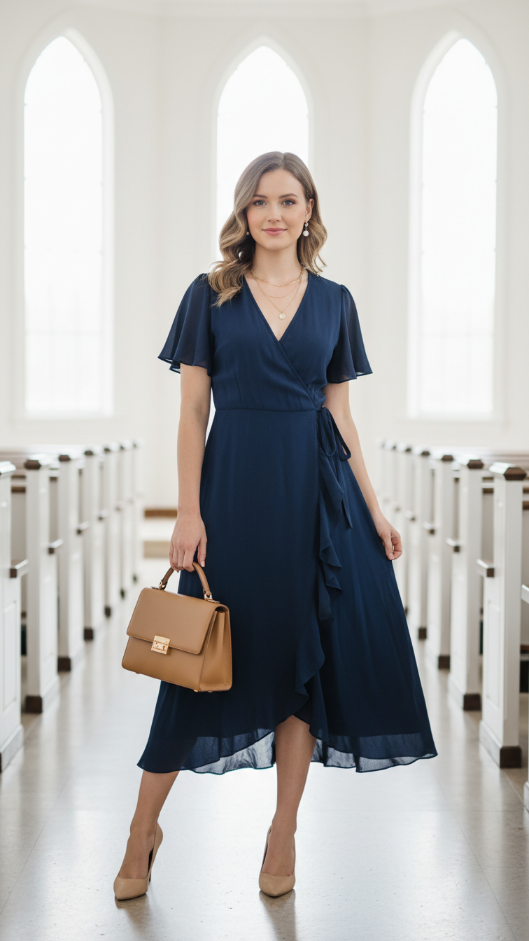 A navy wrap dress embodies classic charm and practical design, a winning option for Baptist church worship. Its adjustable silhouette flatters diverse body shapes, ensuring modesty while allowing freedom of movement.