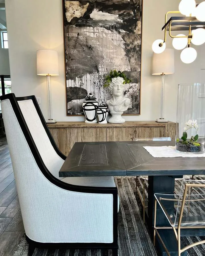Start with neutrally toned furniture then layer in bursts of vivid color through distinct accessories to breathe life into your dining room. Whether a bright ceramic vase or a striking piece of wall art, these restrained splashes make your space feel dynamic yet refined.
