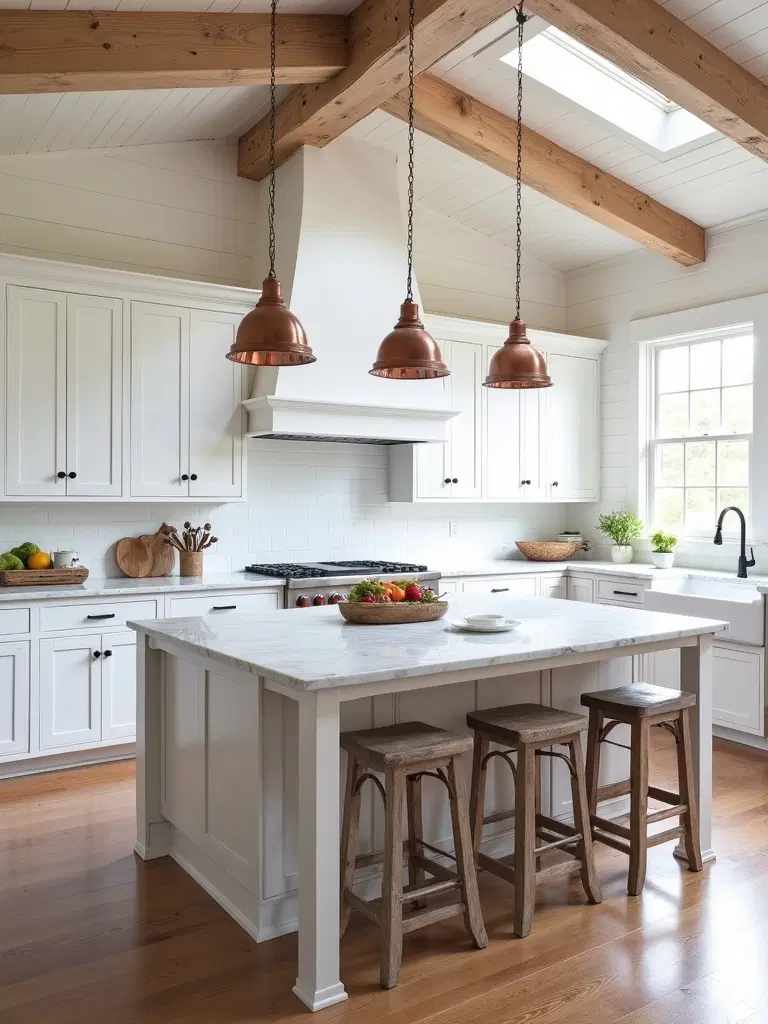 Even in contemporary kitchen designs with neutral backdrops, these beams help create balance, grounding modern elements with natural textures that embody the farmhouse ethos.