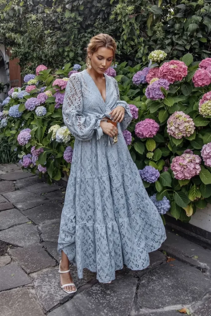 A delicate lace dress in a gentle blue shade epitomizes spring’s charm. This silhouette is my go-to for daytime outdoor weddings, especially those steeped in romantic ambiance. The midi length offers a refined touch without feeling too formal, while the flowy skirt sways with an effortless grace that embodies the lightness of spring wedding guest attire.