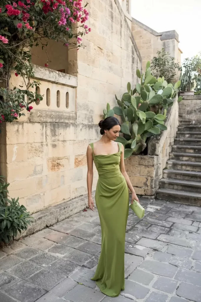 A mid-green dress featuring sculptural draping and a square neckline brings a rejuvenating presence to spring weddings, particularly those hosted in scenic destinations surrounded by nature and stone architecture.