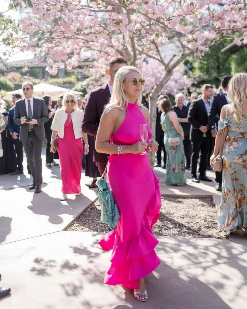Dramatic fuchsia gowns with layered ruffles bring grand occasion energy to spring weddings. The balanced halter neckline ensures sculptural formality, while tiers create stunning movement.