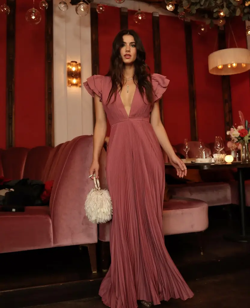 Pleated gowns in dusty rose bring a quiet elegance to indoor evening affairs. The tactile pleats glide lightly around the silhouette, paired with soft flutter sleeves and a flattering neckline, creating a look that’s romantic yet modern.