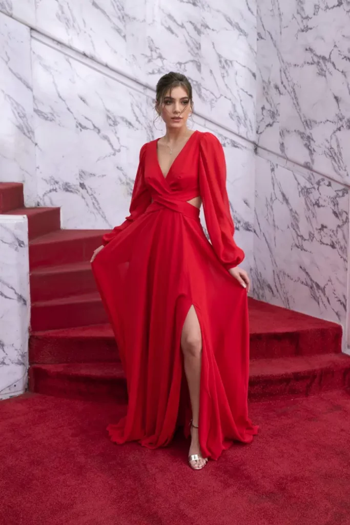 A flowing red gown with sculptural drapes and modest cutouts commands attention without excess. The design combines power and romance seamlessly—ideal for formal weddings in grand venues.