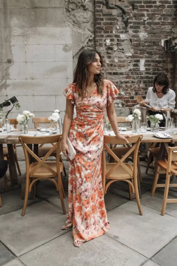 Floral patterns remain a spring staple, especially those with soft, blended hues reminiscent of watercolor paintings. This dress captures that spirit with warm pinks and oranges, suitable for breezy garden weddings.