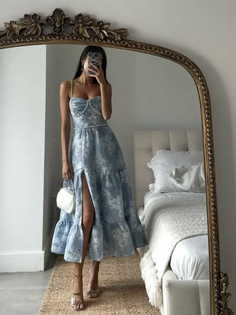 Powder blue offers a serene elegance, highlighted in a printed dress with pearl accents and a romantic sweetheart neckline. The subtle flare and slit enhance walkability and freshness, creating classic spring guest attire suitable for relaxed mornings.