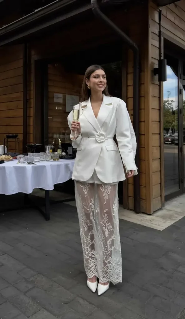 Blending sharp tailoring with delicate lace pieces—such as a belted white blazer and sheer lace trousers—crafts a bold yet refined look ideal for modern venues and cocktail parties.