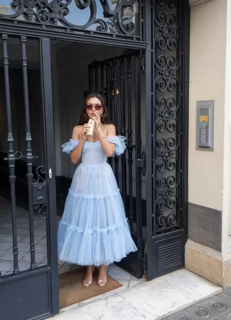 Nothing says fairy-tale spring quite like a cloud-blue tulle gown with off-shoulder ruffles and tiered layers. This dress combines playful volume with softness, creating an ethereal vibe perfect for romantic celebrations.