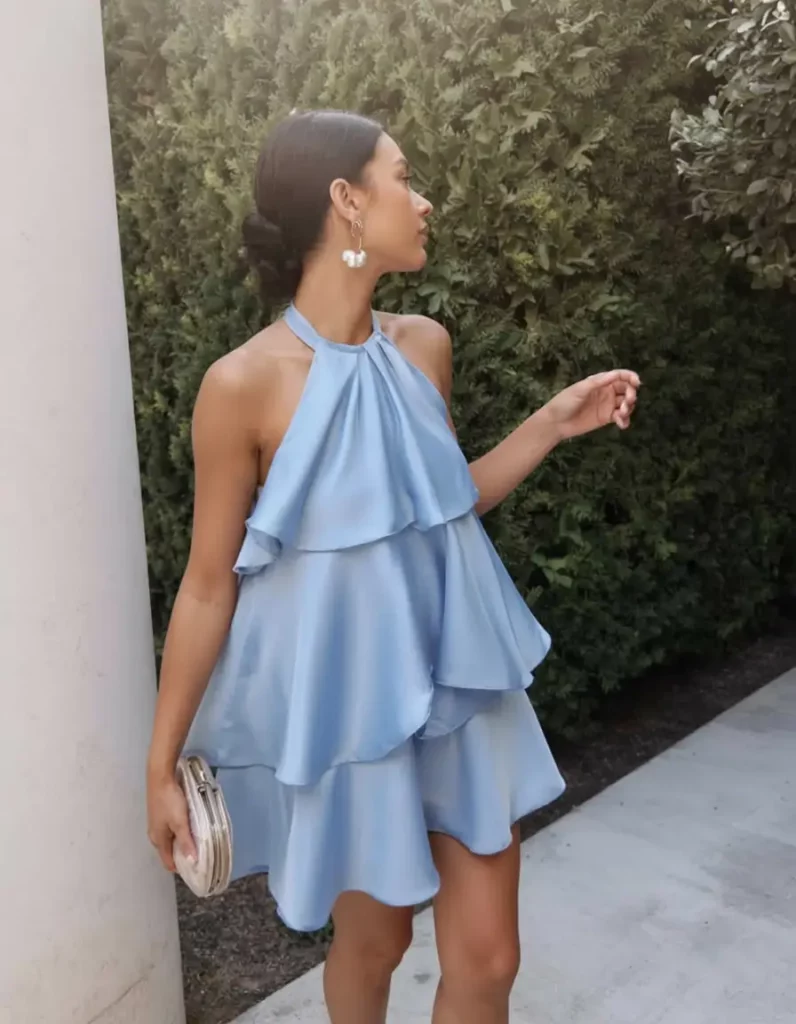 A playful, tiered mini dress in fresh baby blue radiates spring’s vibrancy, especially for relaxed afternoon affairs. The halter neckline keeps it current, while cascading layers add dynamic movement.