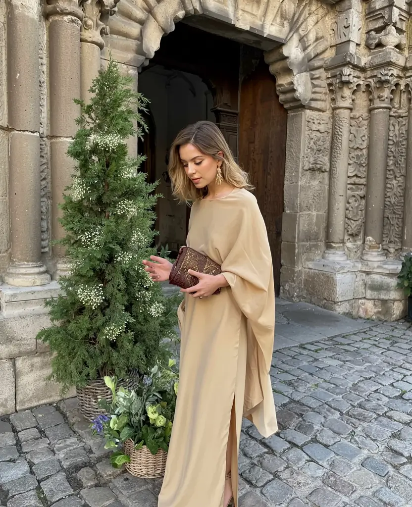 Draped sleeves and a subtle side slit lend the dress a graceful flow without excess or flash. Thoughtful accessories—such as a woven clutch, sculptural earrings, and refined heels—elevate this look, creating a balance of sophistication and contemporary flair that’s perfect for polished wedding guest ensembles.