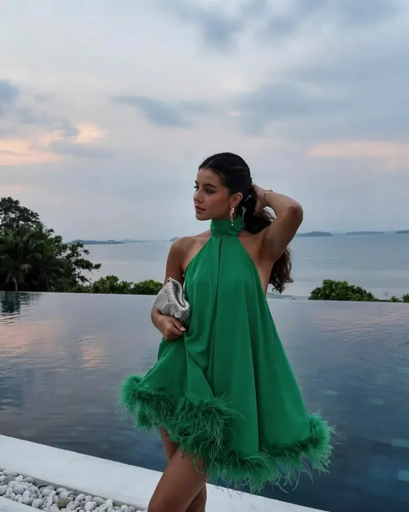 A mini emerald dress trimmed with feathers brings a unique festive twist suitable for vibrant waterfront or destination receptions. The high neckline balances playful details, yielding a polished-yet-fun vibe.