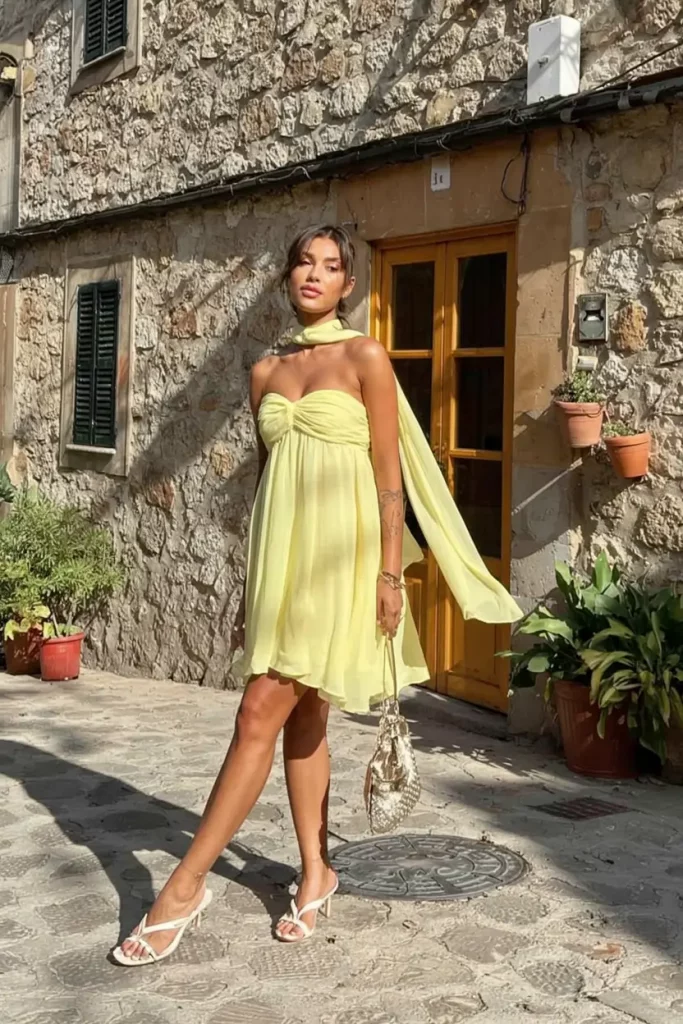 This chiffon mini dress in soft lemon yellow radiates breezy playfulness with gathered detailing and a graceful neck tie. It’s perfect for warm, outdoor weddings with a relaxed yet polished vibe.