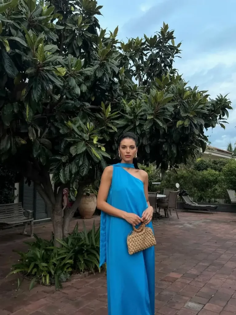 A bold cerulean one-shoulder gown with draped scarf detail exudes sculptural sophistication while maintaining a minimalist aesthetic. This look is perfect for guests seeking refined simplicity in vibrant hues.
