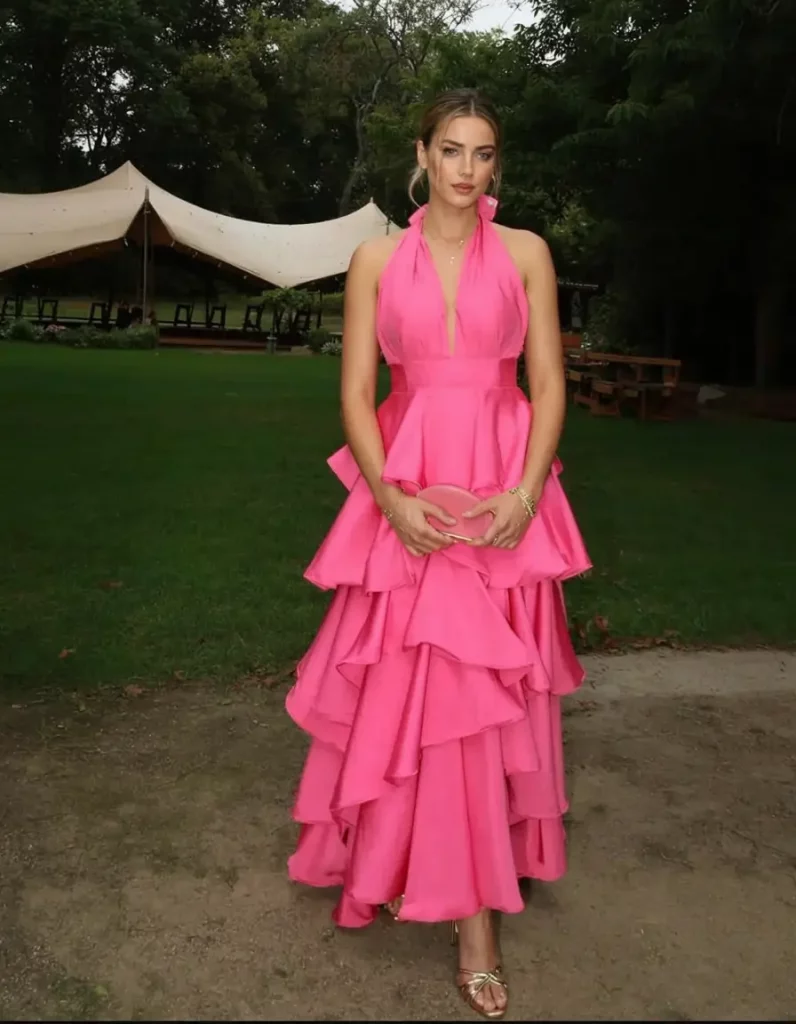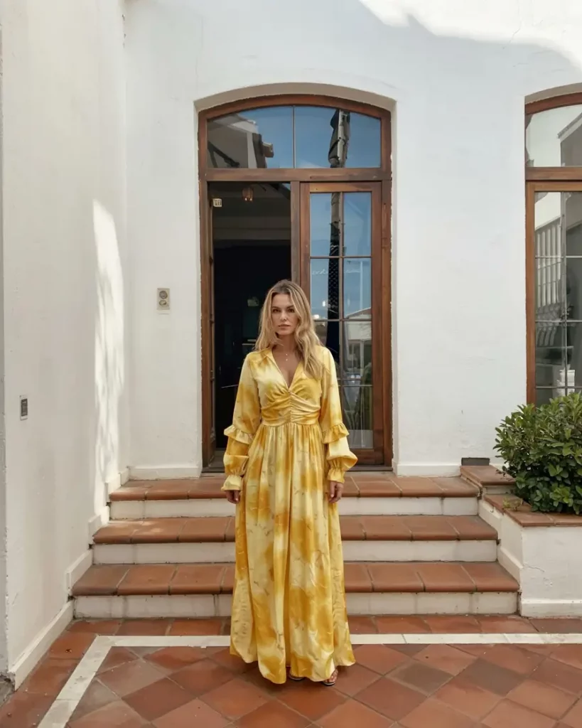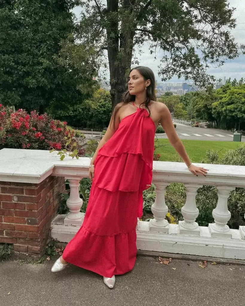The ruffled tiers add movement without losing refinement. Accessory choices should be minimalist—think nude sandals, delicate jewelry, and soft-hued handbags—to keep focus on the eye-catching dress.