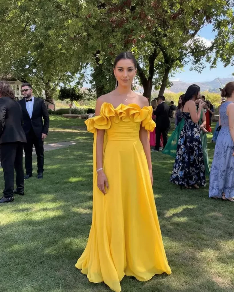 Bright gold dresses with sculptural ruffles evoke a sense of fantasy and grandeur, ideal for lush outdoor weddings where natural light accentuates every detail.