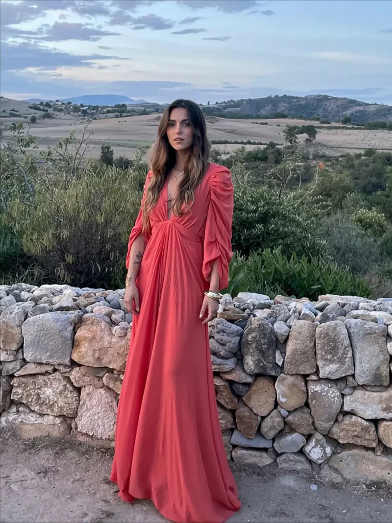 The garment’s draped neckline and billowy sleeves enhance its romantic spirit, while the vibrant color keeps the overall look fresh and inviting. Coral’s inclusivity across skin tones makes it a versatile choice favored by many stylists as an alternative neutral this season.