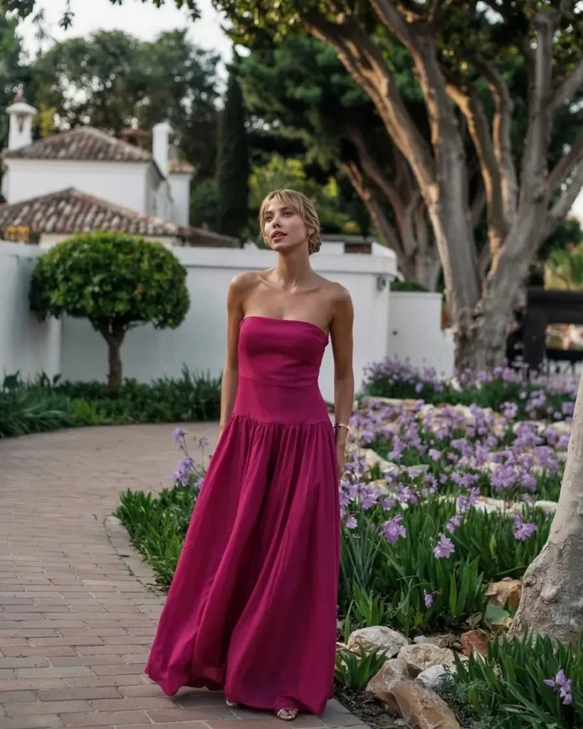 A striking strapless fuchsia gown exudes vibrant springtime energy. Its clean bodice and softly voluminous skirt deliver an exquisite dance between structure and flow. This silhouette epitomizes the kind of spring wedding guest attire that bridges formality and joy effortlessly.