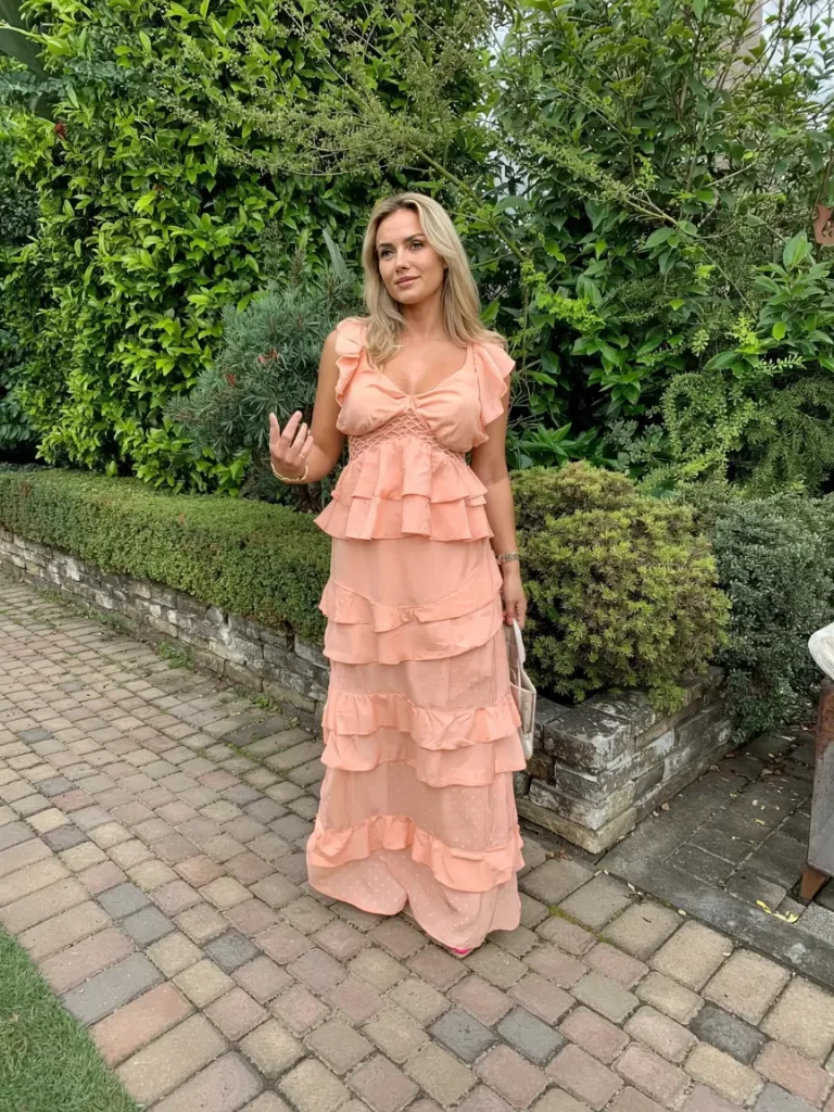 Peach feels like spring’s softer alternative to pink, exuding warmth and flattering most complexions. A ruffled dress in this shade offers a charming vintage-modern fusion ideal for cozy garden ceremonies.