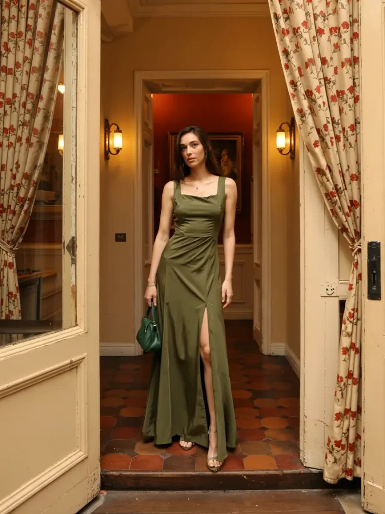 Olive green delivers an effortlessly chic look, especially in a gown with smooth draping and a sharp slit. This style excels at formal evening weddings and refined gatherings.