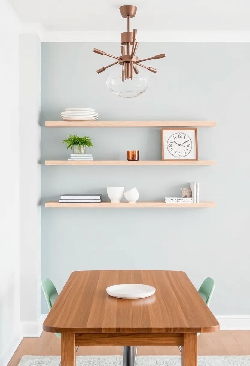 Incorporating shelving into your accent wall design not only elevates the visual appeal of your dining room but also maximizes functionality. Consider using floating shelves to create a modern and airy feel. These shelves can be arranged in various patterns, allowing you to play with heights and spacing to draw the eye. Use them to showcase your favorite decorative pieces or dining essentials, making the space both inviting and practical.Consider these shelf styles for optimal impact: